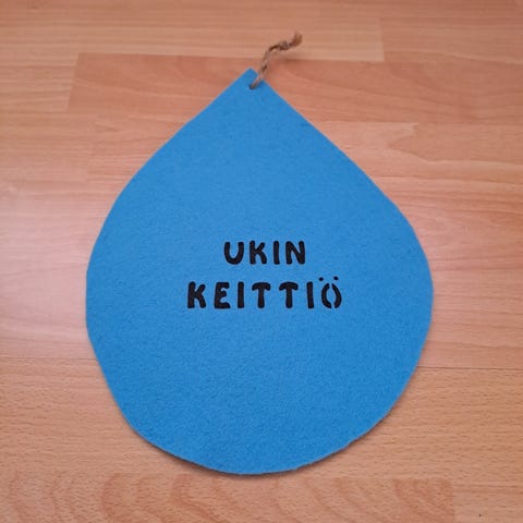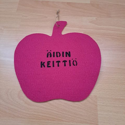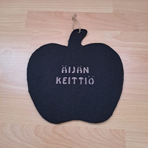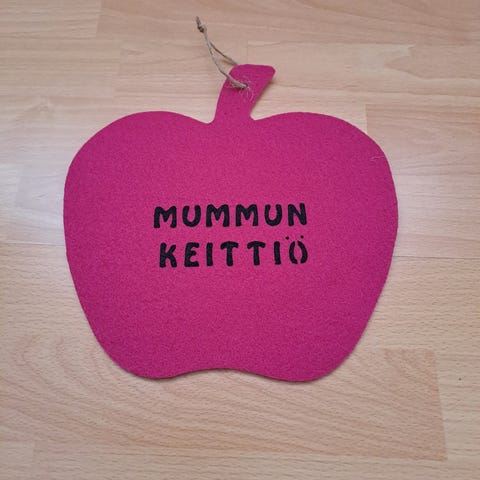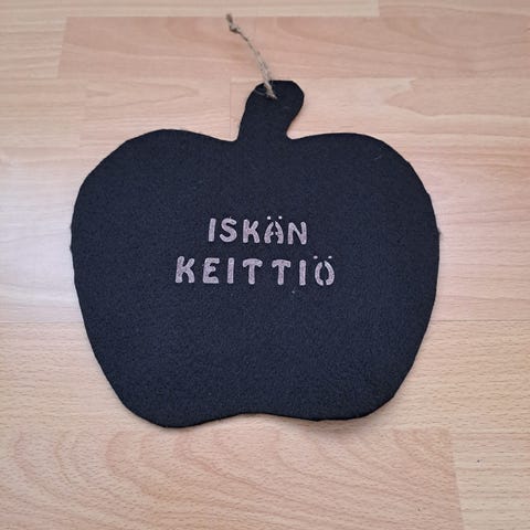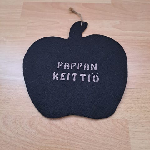Uusi huovasta tehty omena pannunalunen, käsinpainettu vaarin keittiö teksti.