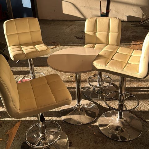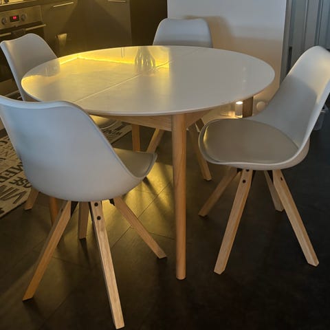 Myydään valkoinen puinen 6- hengen jatkettava ruokaryhmä.