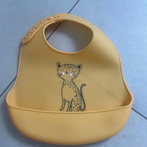 Suloinen eläinkuvioinen ruokalappu. Kevyt ja mukava. Konepestävä.