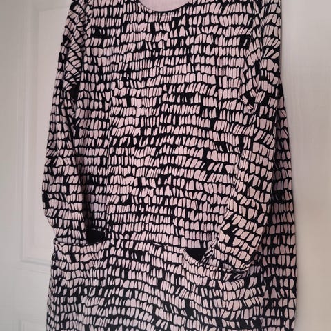 Yläosa joustavaa kangasta, kai-kai n.52cm. hihat ja helma ryhdikkäämpää, joustamatonta kangasta