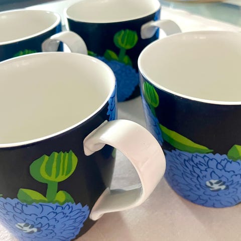 Sinivalkoiset Primavera-mukit erittäin hyvässä kunnossa, ei naarmuja / kolhuja. Kiiltävä lasite.