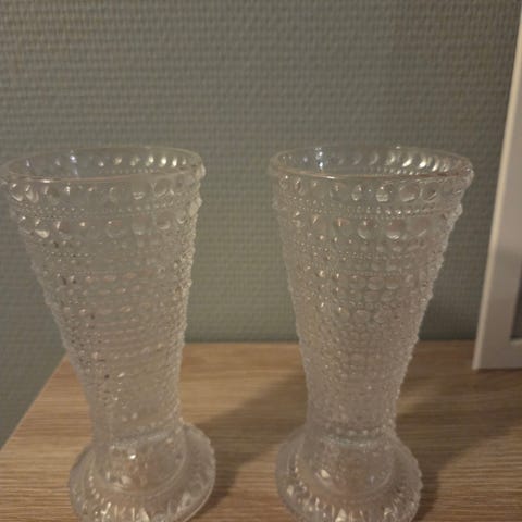 Viisi kirkasta kastehelmen kynttilänjalkaa/maljakkoa 30 € KPL