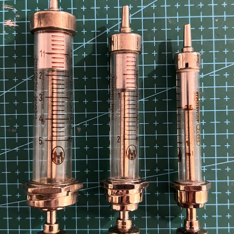 Vanha lasinen lääkeruisku. Ei sisällä piikkejä eikä suositella käyttöön.