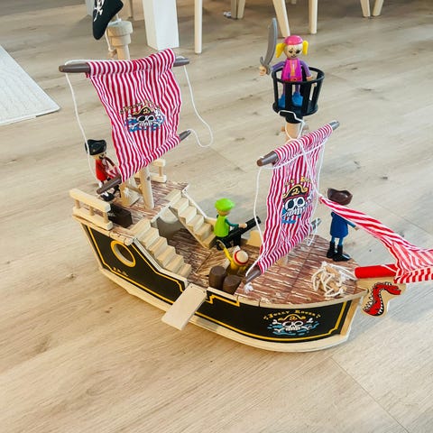 Myydään hyvässä kunnossa merirosvolaiva pyörillä. Pituus n. 50cm, korkeus 55cm.