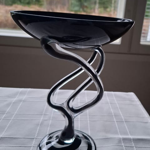 Kaunis lilan värinen lasinen astia jossa hieman vaalean vihreää ja oranssia. Keväinen kaunis astia vaikkapa pääsiäiskattaukseen.
