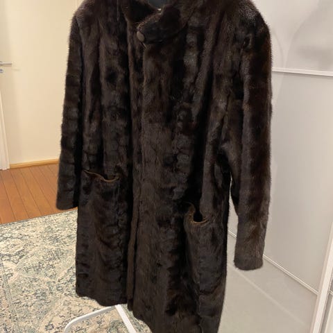 A-linjainen klassinen ja ajaton naisten aito minkkiturkki, sivutaskut. Hakassuljenta ja kauluksessa iso nappi. Kaunis tummanruskea ja kiiltävä karva, sekä ehjä vuori.