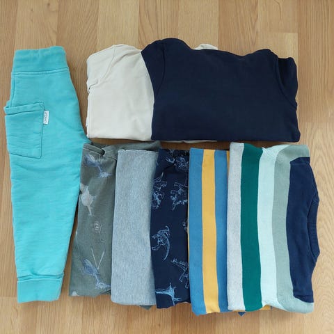Siistikuntoisia vaatteita koossa 104. Vaatepaketti sisältää kymmenen vaatetta: