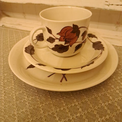 Myynnissä hyväkuntoinen Arabian Cafe-astiasto. Ainoastaan yhdessä kupissa on särö.