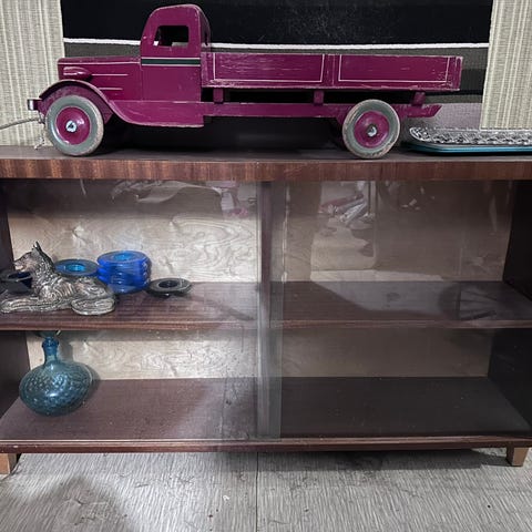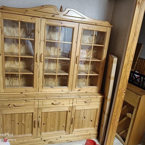 Myydään siisti ja hyväkuntoinen puinen vitriini lasiovilla ja hyllyillä.