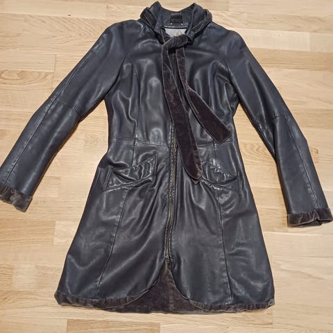 Leonardo vyötärömallinen takki on valmistettu nahasta ja väriltään punainen. Takki on naisten kokoa L Hihan pituus kainalo-hihansuu 51 cm, koko pituus 63 cm. On vuorellinen