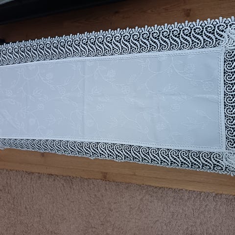 Pitsinen kaitaliina kimaltelee kaunisti. Valkoinen,mmm.