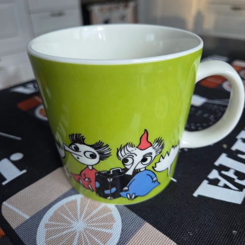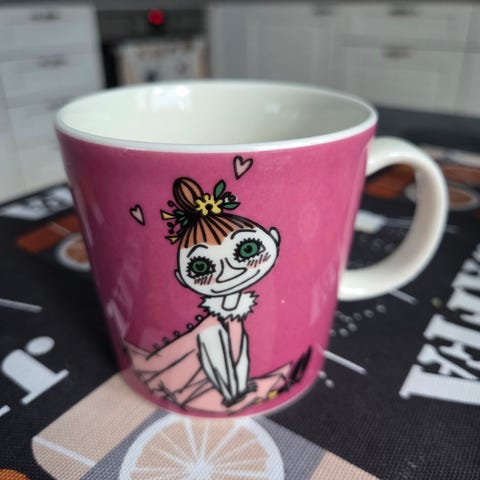 Arabia Nipsu muumimuki, joka ollut tuotannossa vuosina 2008-2023. Muki on ollut käytössä muutamia kertoja. Toisessa kuvassa näkyy tummat jäljet mukissa.