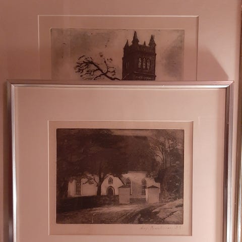 Taulu, jossa on puinen kehys. Taulun kuva esittää aurinkoista kuistia ja merenäkymää.