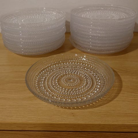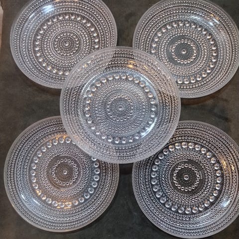 Myytävänä 6 kpl Kastehelmi lasinalunen / pieni lautanen. Nuutajärvi Oiva Toikka. Halkaisija 8,5 cm korkeus 1,5 cm. Ehjät ja hyväkuntoiset.