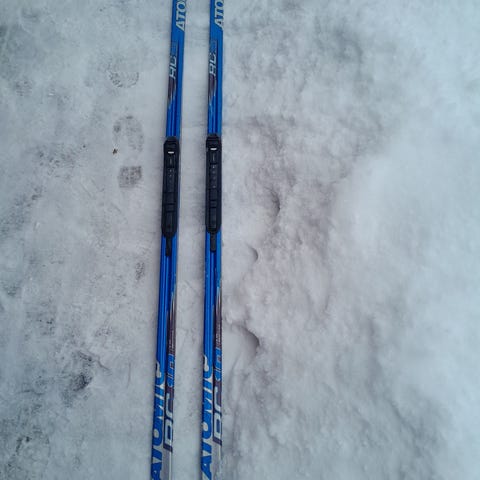 Kahdet sukset. Varsinkin punaiset 120cm sukset jo kuluneemmat ja päältä muovi hieman irtoillut paikoitellen kuten lähikuvassa näkyy. Menettelee varmaan kuitenkin vielä aloittelijalle. Siniset ok käytetyssä kunnossa. Nanogrip pohja. Molemmissa NNN-side Punaiset 10e ja 130cm 20e