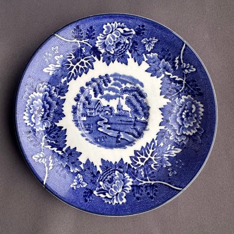 Kyseessä on perinteinen englantilainen posliinimalli, jossa hillitty ornamenttikuvio ja käsin viimeistelty kultareunus.