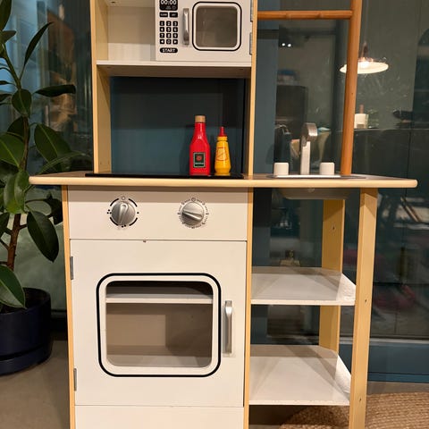 Kuvan leikkikeittiö josta puuttuu lavuaari , hellan napit ja kaapista hylly.