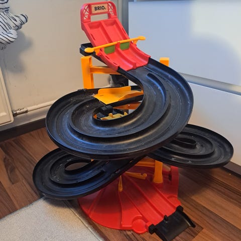 BRIO lasten leikkiauto rata, jossa on useita tasoja ja liukumäkiä punaisena ja sinisenä. Valmistettu kestävästä materiaalista, soveltuu lasten leikkeihin.