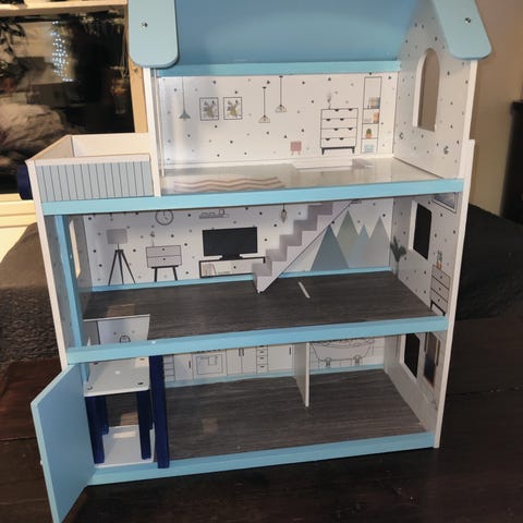 Upea pinkki nukekoti jossa on kaksi kerrosta ja ullakko. Talon etuosan saa auki ja on erittäin hyvässä kunnossa. Nukkekoti on ostettu aikoinaan Hoppy Hallista. Nukkekodin tavarat ja lelut tulevat mukana.