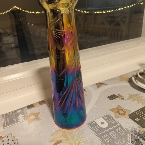 70- luvulla lahjaksi saatu itämaiselta vaikuttava maljakko, korkeus 17,5 cm, pohjan halkaisija 7 cm. Lahjoittaja sanoi koristelussa olevan kultausta. Malja oli eri kouluissa "Matisse-asetelmien" yhtenä elementtinä joten krakeloissa löytyy. Vain nouto ja käteismaksu.