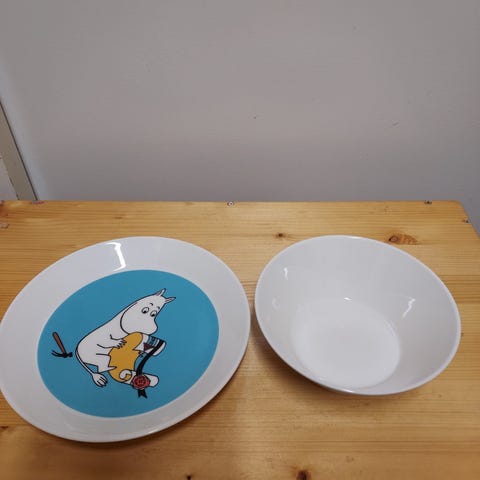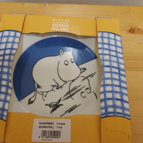 Muumipeikon ja Pikkun Myyn hahmot. Myydän alkuperäisessä laatikossa, Tove 100 vuotta.