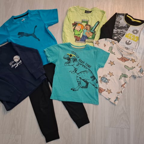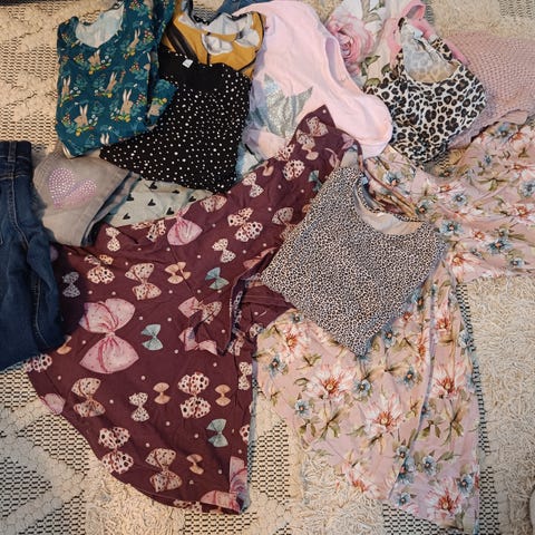 Sisältää 4 housut. 6 paitaa ja kaupan päälle saa leopard leggsit,niissä vaaleanpunainen pieni tahra,muut vaatteet siistejä, yhdellä käytetty merkkeinä paljon Lindex