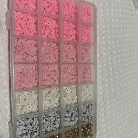 Helmirasia, jossa on useita pieniä lokeroita erilaisia kirjaimia ja numeroita sisältäviä helmiä. Helmet ovat monivärisiä ja sopivat esimerkiksi korujen ja askartelutöiden tekemiseen.