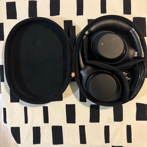 Sony WH-1000XM3 langattomat vastamelukuulokkeet, musta väri. Ylikorvakuulokkeet, pehmustetut korvakupit ja säädettävä panta. Mukana kuljetuskotelo, äänikaapeli ja usb-c kaapeli. Kuppien pehmusteissa hieman kulumaa.