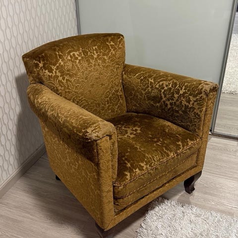 Vanha kukkakuvioinen verhoiltu nojatuoli puujaloilla