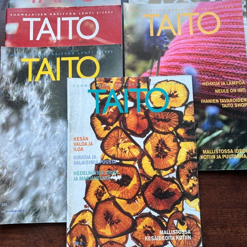 Taito käsityölehdet eri vuosikerrat sisältäen erilaisia aiheita kuten käsityöt, terveys, matka-aiheet, retrotyylit ja värilliset käsityöt. Lehdet tarjoavat monipuolista sisältöä käsityöharrastajille. 5 kpl/10€