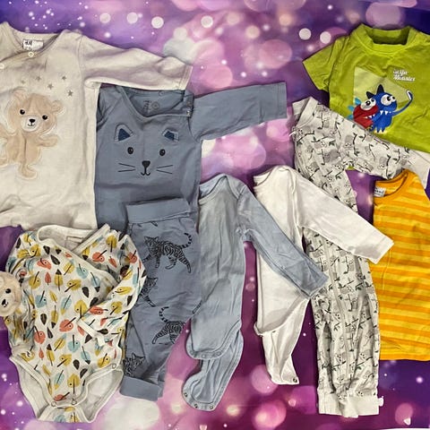 Setti koossa 68. Body, neule, kahdet housut, pipo, kaulalaput ja sukkia.