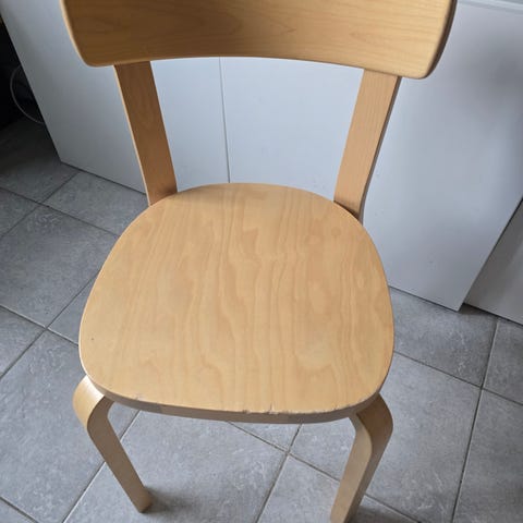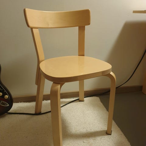 Artekin 69 tuoli. Tuolin istuinosan on vaihdettu päällinen. Tuoli on muuten alkuperäisessä kunnossa. Tuolissa talttapää ruuvit.