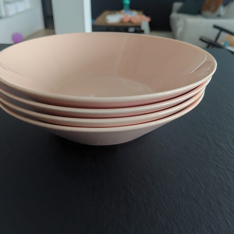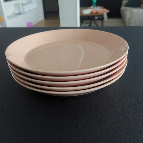 6kpl Iittala teema isoja lautasia ihanassa sävyssä Puuteri. Värin valmistus jo lopetettu. Halkaisija 26cm. Normaalia käytön jälkeä eli valoa vasten naarmuja pohjassa. Oikein Siistikuntoiset käytetyt kuitenkin. Ei kolhuja. Myynnissä myös muita saman sarjan lautasia, kts ilmoitukset.