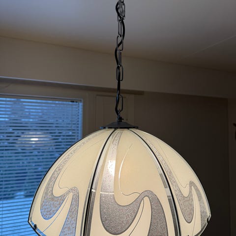 Ikean kattovalaisin valkoista lasia, lasin halkaisija 20 cm ja korkeus 43 cm. Toimii ja hyväkuntoinen. Lasissa ei säröjä tms. Kuvassa ripustettu korkealle mutta johtoa riittää matalammallekin. Vain nouto.