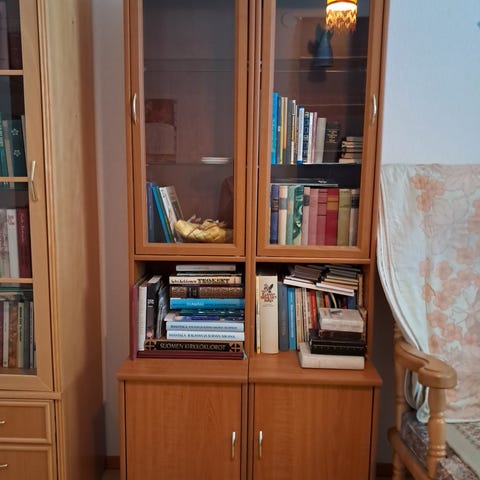 Pyökinvärinen, soikeat kahvat, ostettu v. 2004 Askosta. Puiset hyllyt, lasiovet. Tarvitaan yksi korkea kirjahylly (kaksi moduulia päällekkäin) lisää. Haku onnistuu Ylöjärveltä 200km suuntaansa. Tarjoa jos sinulta löytyy tätä sarjaa!