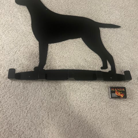 Koira-aiheinen puinen naulakko, käsintehty Suomessa Oitissa. Naulakossa on koiran muotoinen yläosa ja luun muotoinen alaosa, jossa on kolme naulakkoa. Materiaali on puuta. Korkeis 17 cm, leveys 20 cm. Käyttämätön.