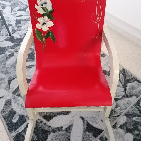 Lasten tuoli keinutuoli, valmistettu muovista, värit sininen ja keltainen. Sopii lasten käyttöön ja tarjoaa keinumisen mahdollisuuden.