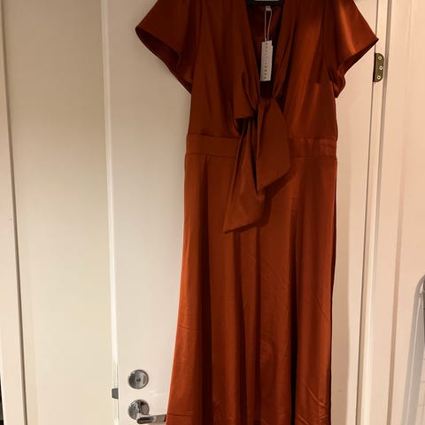 Fuksianvärinen juhlamekko kiiltävää satiinia, koko 34. Kapeat olkaimet saa myös irti. Käyttämätön, laput kiinni. Kankaaseen tullut joitain langannousuja säilytyksessä.