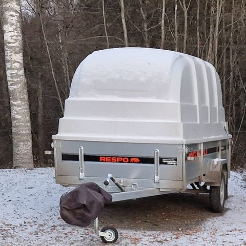 Teliakselinen kuomukärry. Telin ansiosta tosi vakaa vedettävä, eikä hae uraisellakaan tiellä.