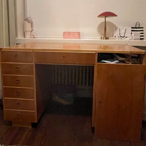 Vanha puinen työpöytä, jossa mustaksi maalattu laminaatti pöytälevy. Laatikoiden avaimet ei löytyy. Vain nouto Tarkk’ampujankadulta.