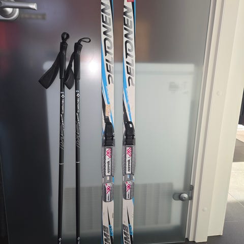 Kenkiin kiinnitettävät sukset kohtalaisessa kunnossa. Pituus 110 cm. Uudenveroiset sauvat. Pituus 80 cm.