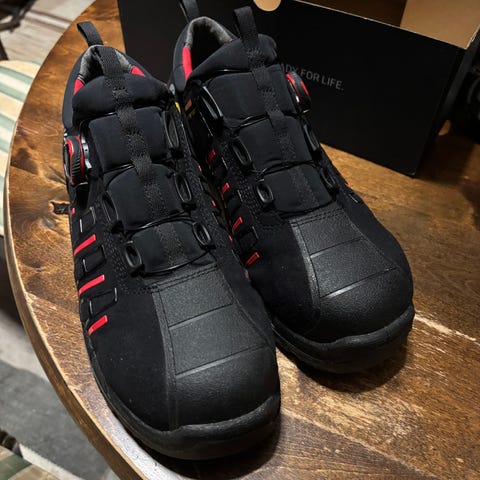 Materiaalit: Päällinen haljasnahka/tekstiili, PU-välipohja, kuminen ulkopohja, polyesteri/polyamidi vuori, komposiittinen naulaanastumissuoja ja alumiininen varvassuoja.