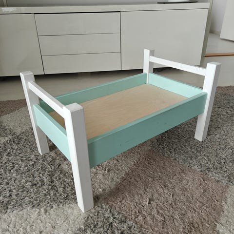Valkoinen nuken sänky. Siisti yleisilme, mut kulumaa ja muutama tussin viiru löytyy