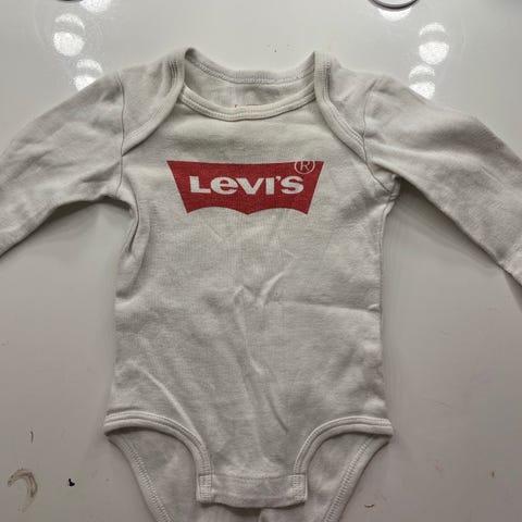 Myydään klassinen vaaleanpunainen Levi’s-body punaisella logolla. Body on lyhythihainen ja siinä on nepparit haarassa helpottamassa pukemista.