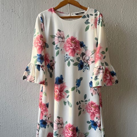 Onlyn kukkahame. Pituus polvien alapuolelle/midi, riippuen kuinka ylös haluat nostaa. Edessä ”kietaisuhalkio”, ei siis ole sidottava vaan vyötärö joustaa, mutta etuosat menevät päällekkäin ja ovat ylös asti auki. Väri tummansininen. Täysin uusi ja käyttämätön. Koko M.