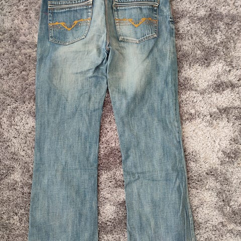 Vanhat ja käytetyt Diesel/Levi's farkut, aikakaudelta ennen stretch-kankaita. Malliltaan leveä/suora lahje, toimii erittäin hyvin buutsien kanssa rokkarille/moottoripyöräilijälle tai ihan yleishousuna.