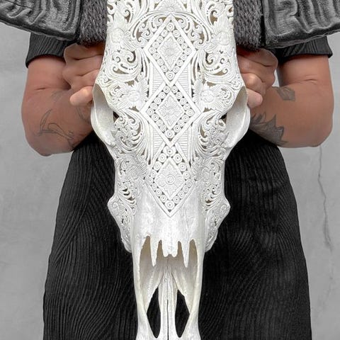 Ei varaustarvetta - aito suuri harmaa kaiverrettu biisonin pääkallo - Flower o