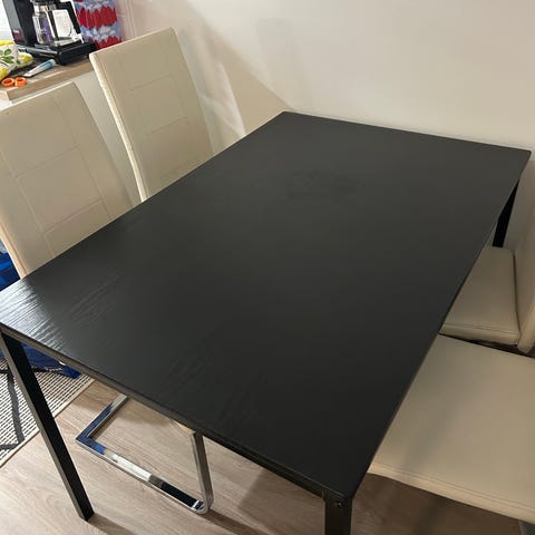 Myydään ruskea ruokapöytä sekä 4kpl mustia tekonahkaisia tuoleja. Jonkin verran käytön jälkiä pöydän pinnalla, Katso kuvat.