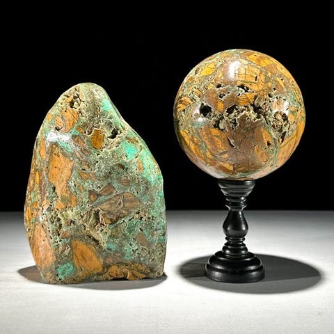 Ihastuttava pari vihreitä smithsonite-sydänmuotoisia kappaleita räätälöidyillä telineillä.Vihreä smithsoniitti, joka tunnetaan myös nimellä vihreä sinkkisavi, on mineraali, joka kuuluu karbonaatit mineraaliryhmään. Se on sekundäärinen mineraali, joka muodostuu primaaristen sinkkivarantojen rapautumisen ja hapettumisen seurauksena. Smithsoniitti esiintyy tyypillisesti eri väreissä, kuten vihreänä, sinisenä, vaaleanpunaisena, keltaisena ja ruskeana. Smithsoniitin vihreä väri johtuu usein kuparipitoisuuksista. Se on suhteellisen pehmeä mineraali, jolla on kovuus 4–4,5 Mohsin asteikolla, mikä tekee siitä naarmuuntuvia.Noin mitat, mukaan lukien jalusta:# Sydän 1: Korkeus 22 cm Leveys: 16 cm# Heart 2: Korkeus 13 cm Leveys: 11 cmVastuuvapautukset:Yksi tai useampi kuva esittää tyyliteltyä esinettä. Tarkat tiedot myytävästä esineestä löytyvät muista kuvista. Tyylitellyssä kuvassa olevat esineet eivät sisälly myyntiin.Paino, joka mainitaan, sisältää pakkausmateriaalin.LähetyksetTuote lähetetään seurantanumerolla DHL Parcelin, DPD:n tai postNl:n kautta. Seuranta päivittyy Catawiki-luettelossasi, kun pakettisi on jätetty postiin.Tarkista säännöllisesti välttääksesi pakettisi palauttamisen meille, jolloin ostaja vastaa toisen lähetyksen toimituskuluista.Seuranta Espanjaan ja Portugaliin: käytä tätä linkkiä ja lisää Catawiki-lotistasi saatu seurantanumero.https://clientesparcel.dhl.es/LiveTracking/HomeME EMME YHDISTÄ TOIMITUKSIA!!!-Jos sinulla on kysyttävää lähetyksestäsi, ota meihin yhteyttä Catawiki-viestipalvelun kautta. Pyrimme vastaamaan kolmeen työpäivään kuluessa.
