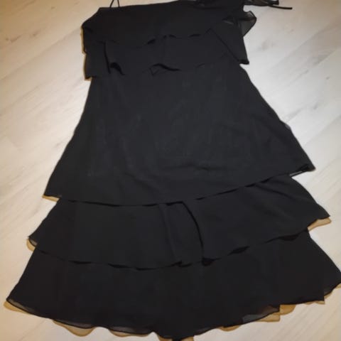 H&M divided malliston pikkumusta yhdellä olkaimella. Koko M. Pari kertaa vain käytetty. Väriltään siis täysin musta, kuvissa joulutähdestä tulee lämmintä sävyä kuviin. Edessä hieman rypytystä, takana ei ole rypytystä.